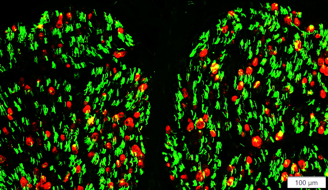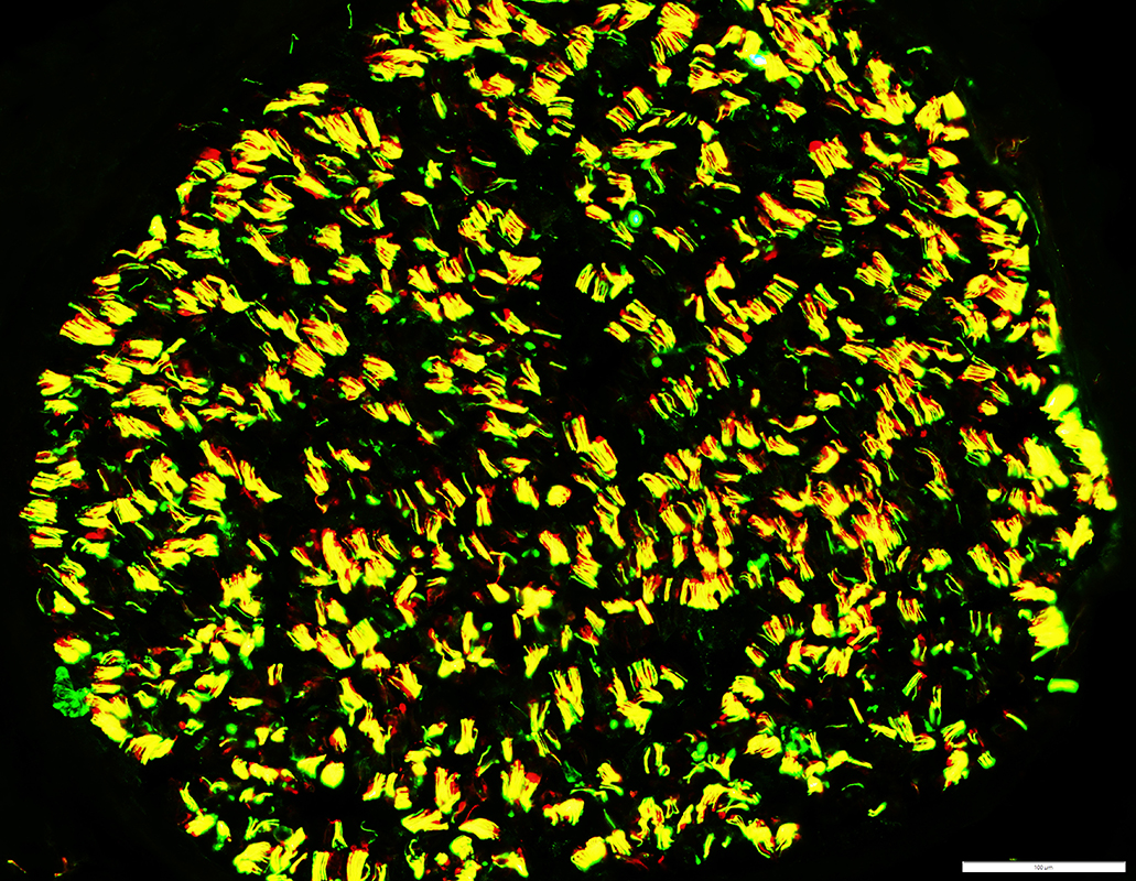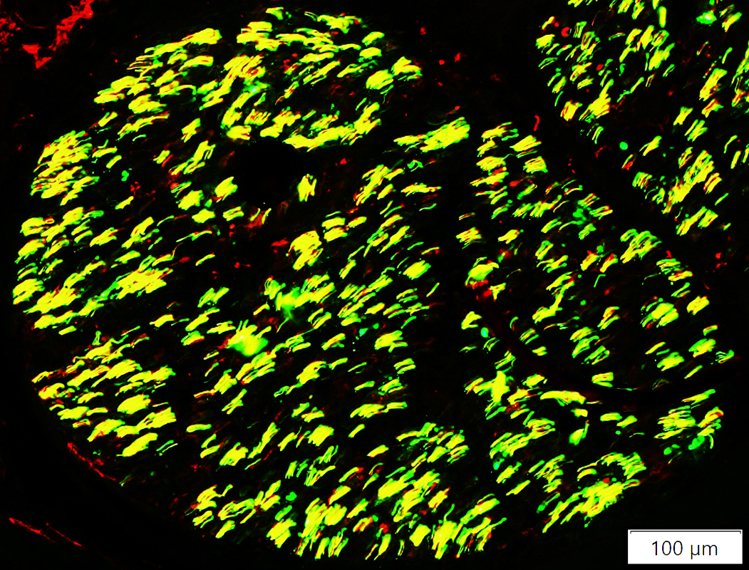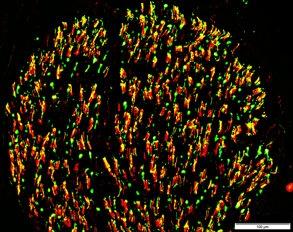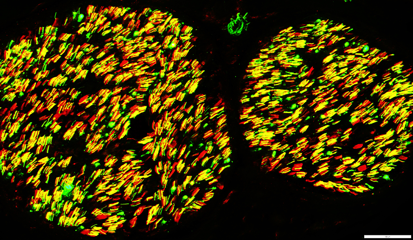 Neurofilament (Green), Myelin basic protein (Red) stain |