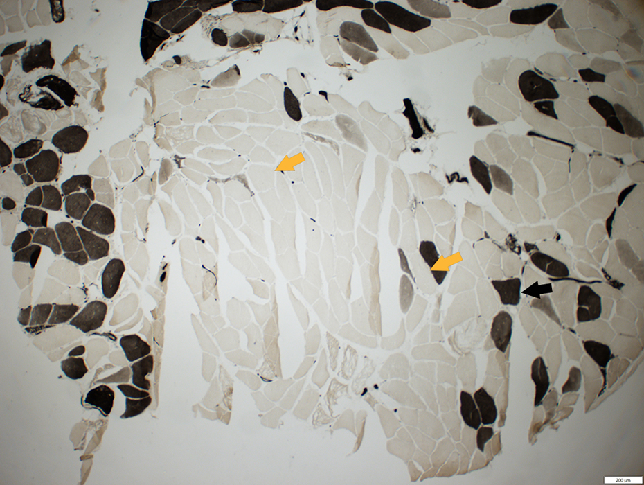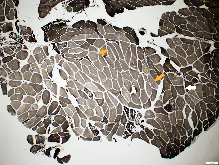 Large muscle fibers: Type predominance Types: 1 or Abnormal with pale stain at pH 9.4 & pH 4.3 Small muscle fibers: Either type 1 or 2 Grouped atrophy: Multiple; Small sizes, Mixed fiber types |