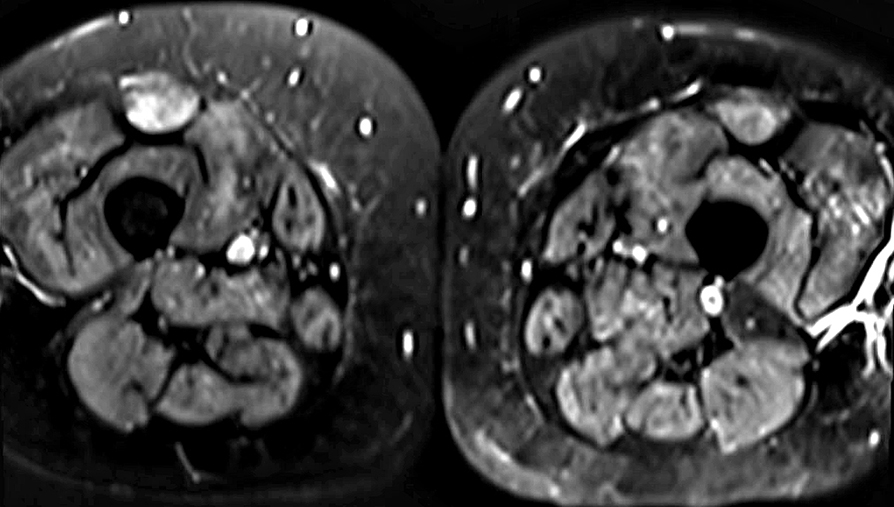 ![]() Myopathy + Fasciitis: Proximal medial right thigh Adductors + Posterior Medial Vastus Around superficial femoral neurovascular bundle ![]() |