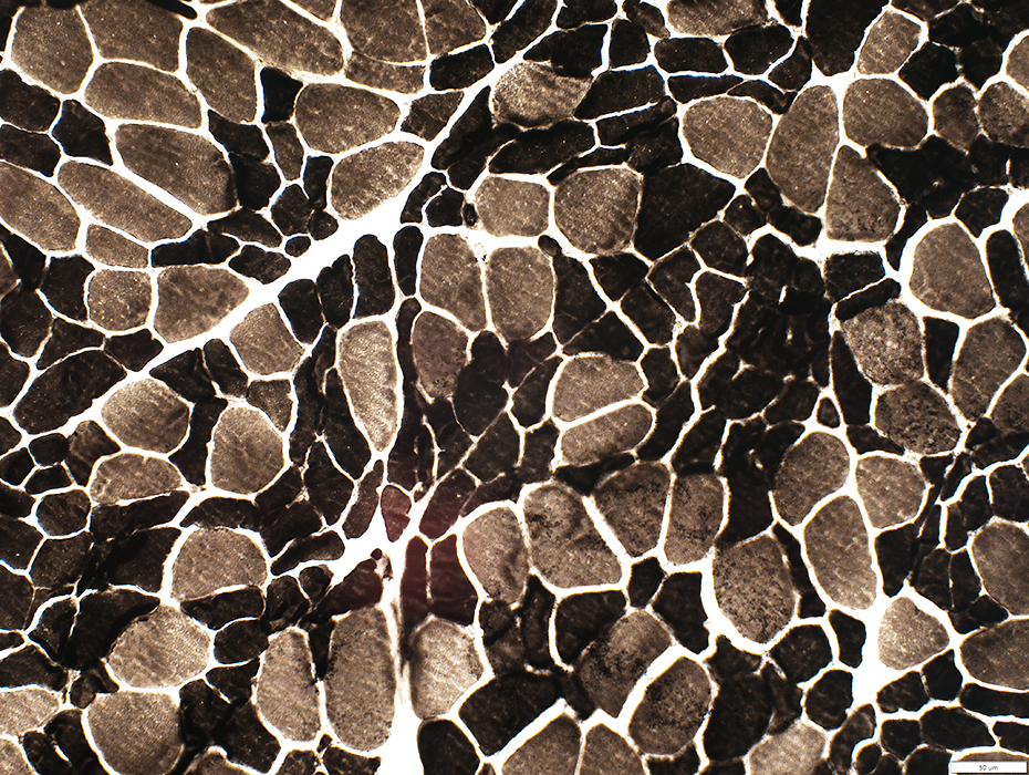 Cytochrome Oxidase (COX) stain: Reduced or Increased Muscle fibers may have reduced, normal or increased COX staining (Right)