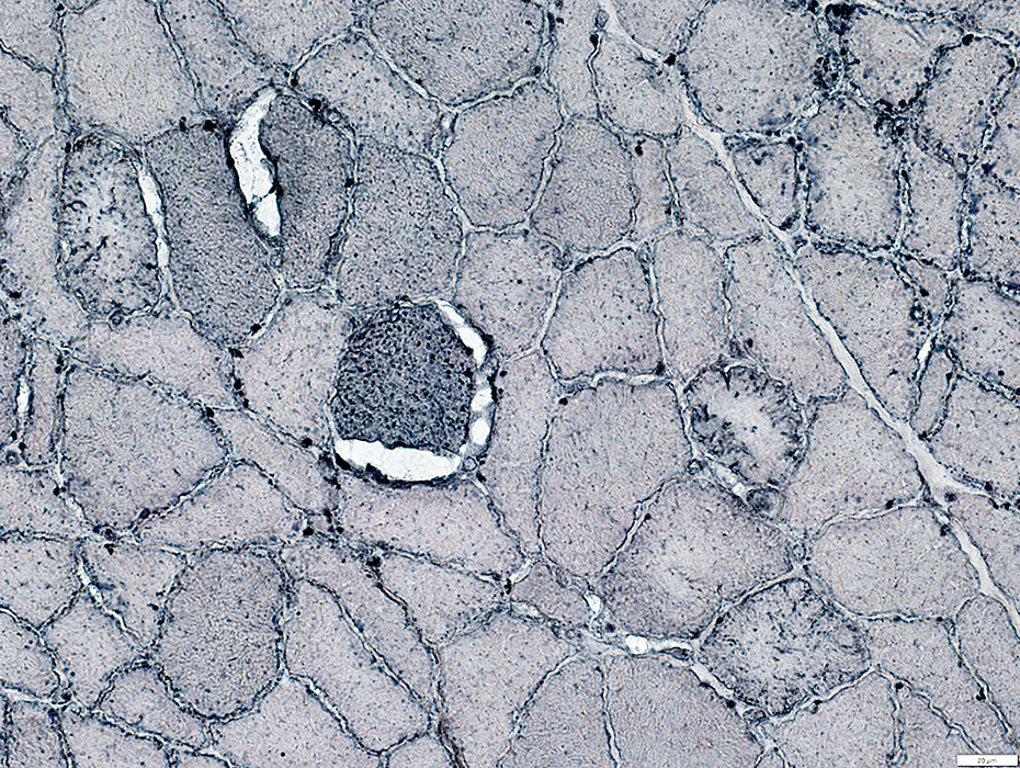Muscle fiber: Increased SDH stain: Individual mitochondria within muscle fiber are enlarged compared to surrounding fibers ![]() |
