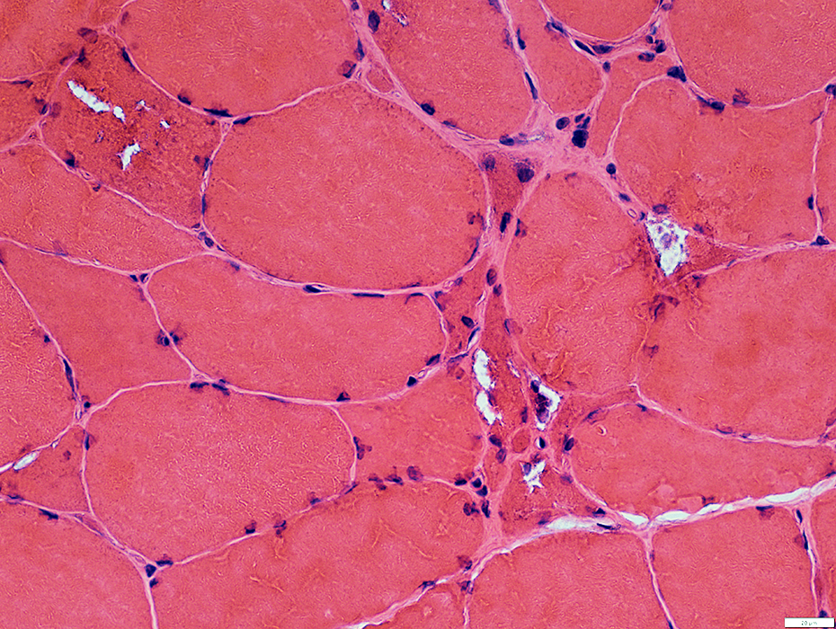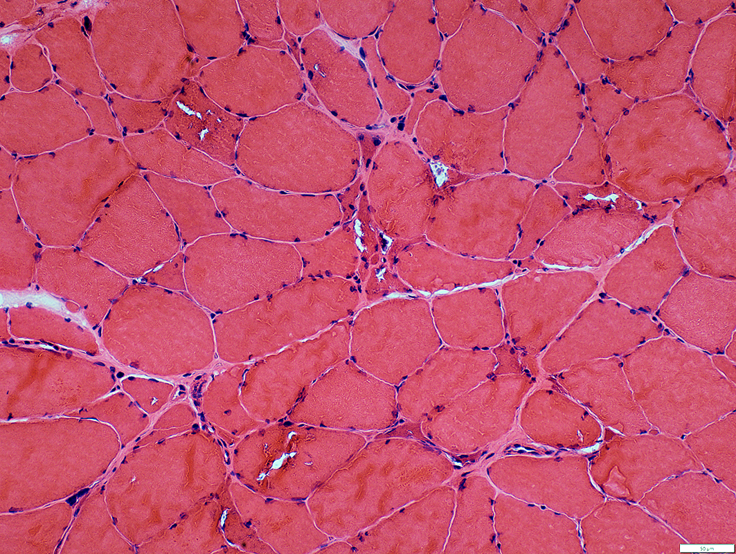 ![]() H&E stain Myopathic features Muscle fiber size: Varied Smaller fibers: May be clustered Endomysial connective tissue: Not prominently increased |