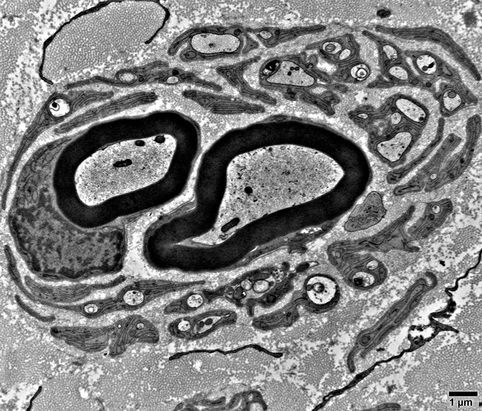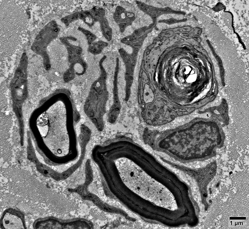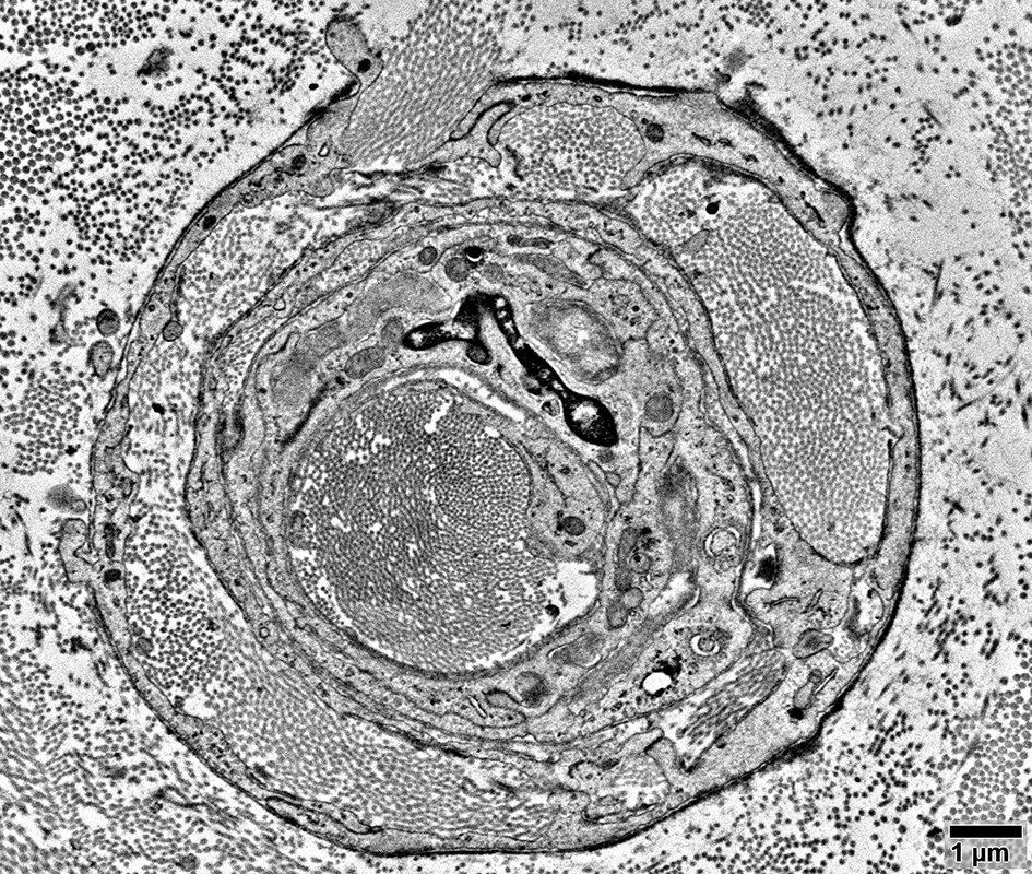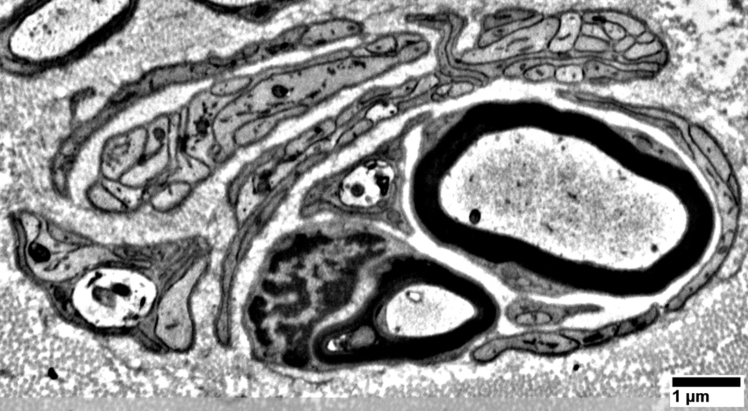 Collagen & Schwann cell processes around thinly myelinated axon (Above)