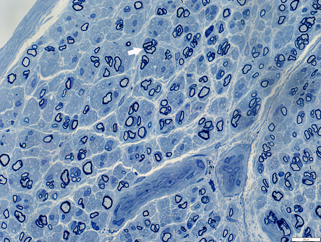 All axons in cluster (Arrow) have nearly normal myelin sheath thickness