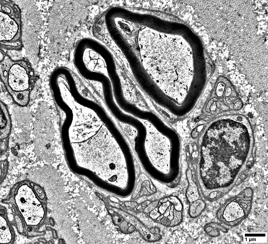 3 Unmyelinated small singleton axons are present (Left & Botom right)