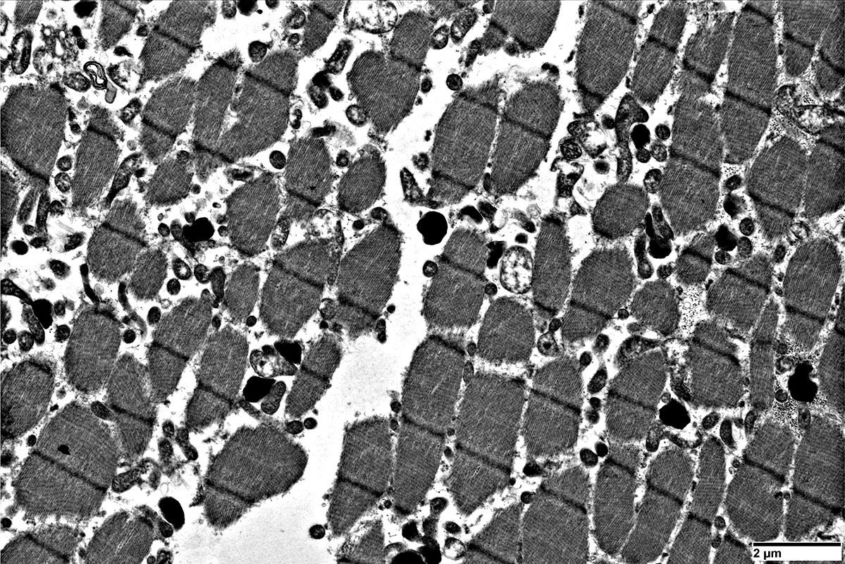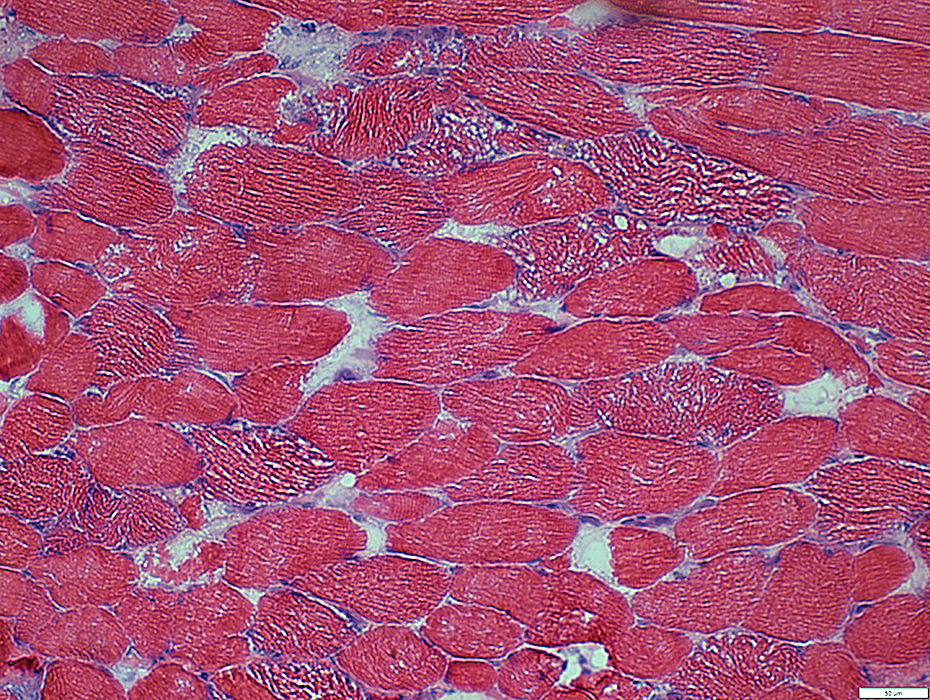 Mitochondria: Increased numbers scattered in muslce fibers