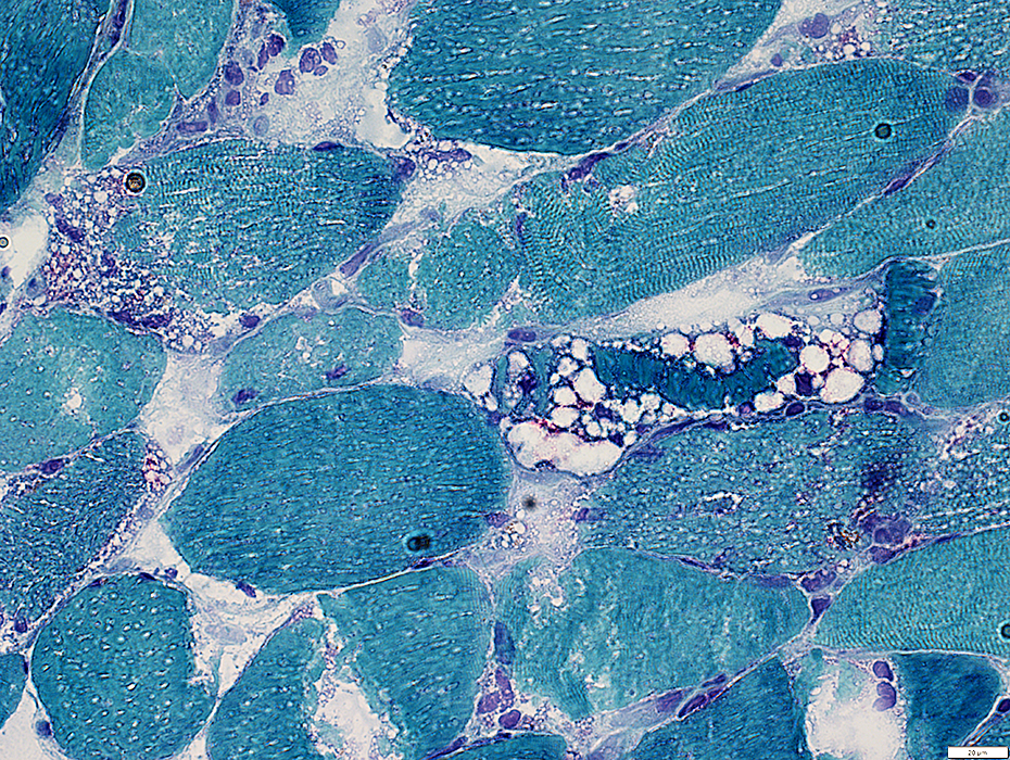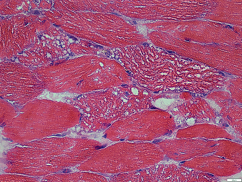 Multiple clear round regions in individual muscle fibers