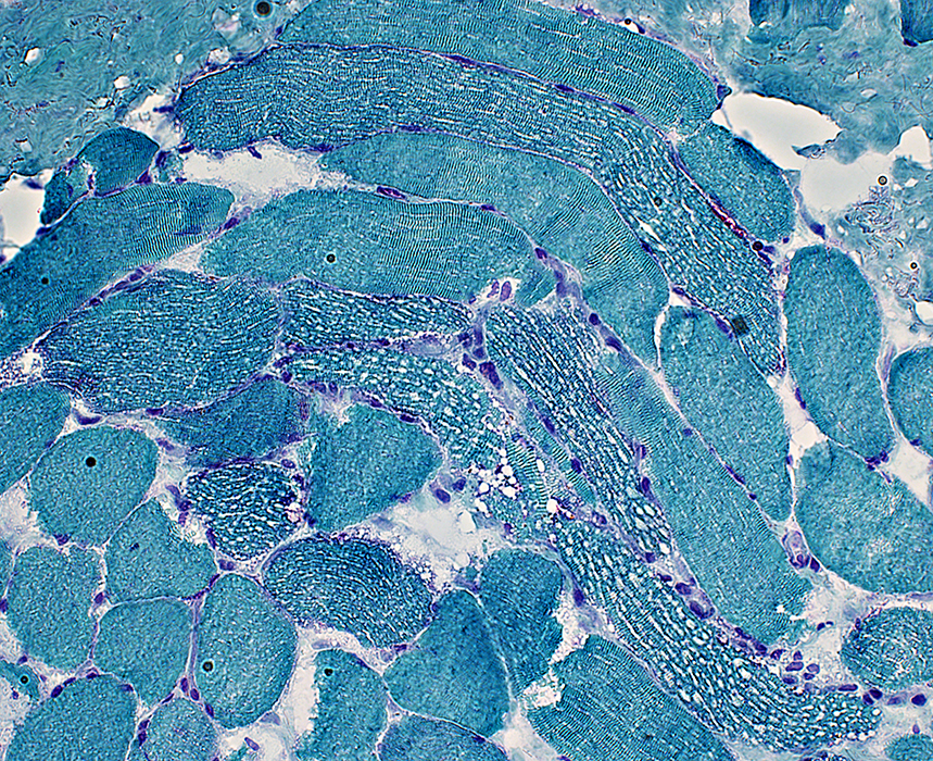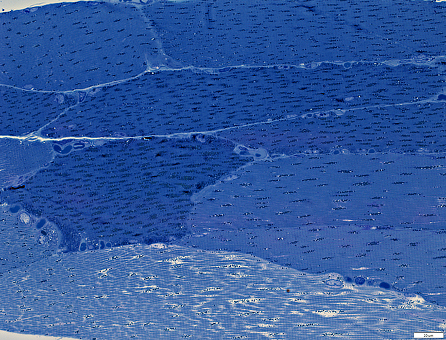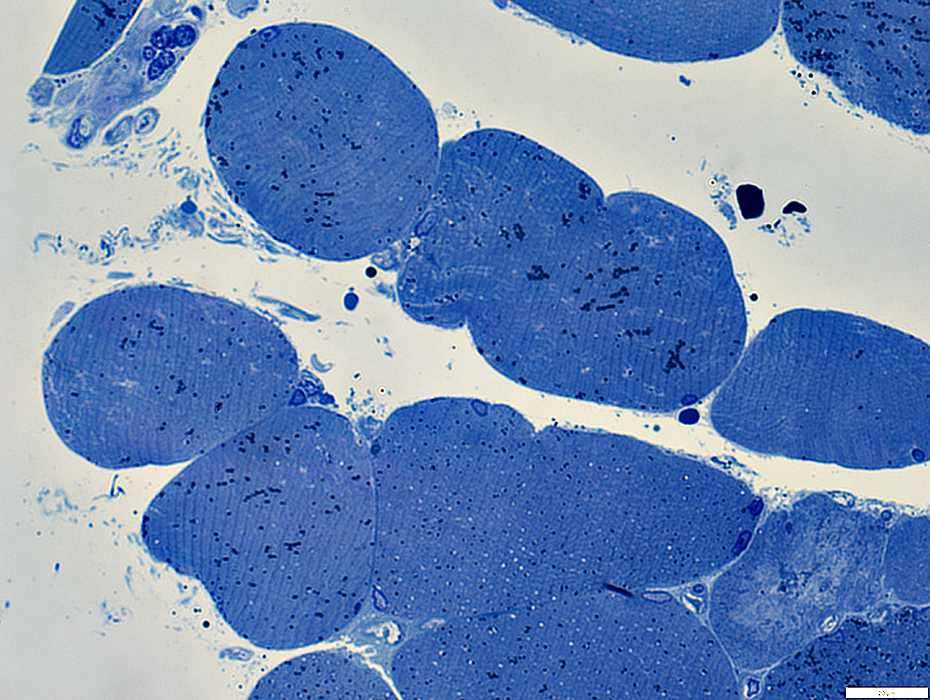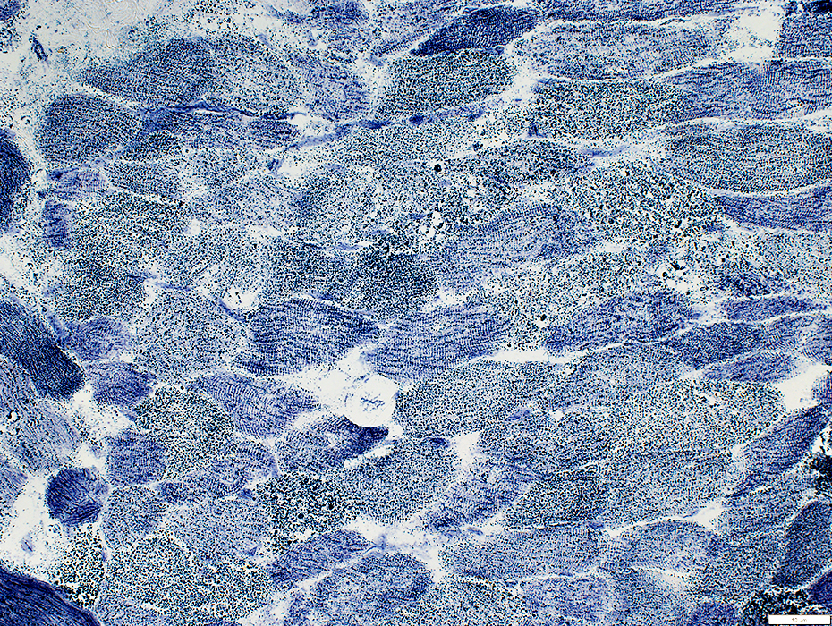 Lipid droplets: Dark stained; Scattered in muscle fibers